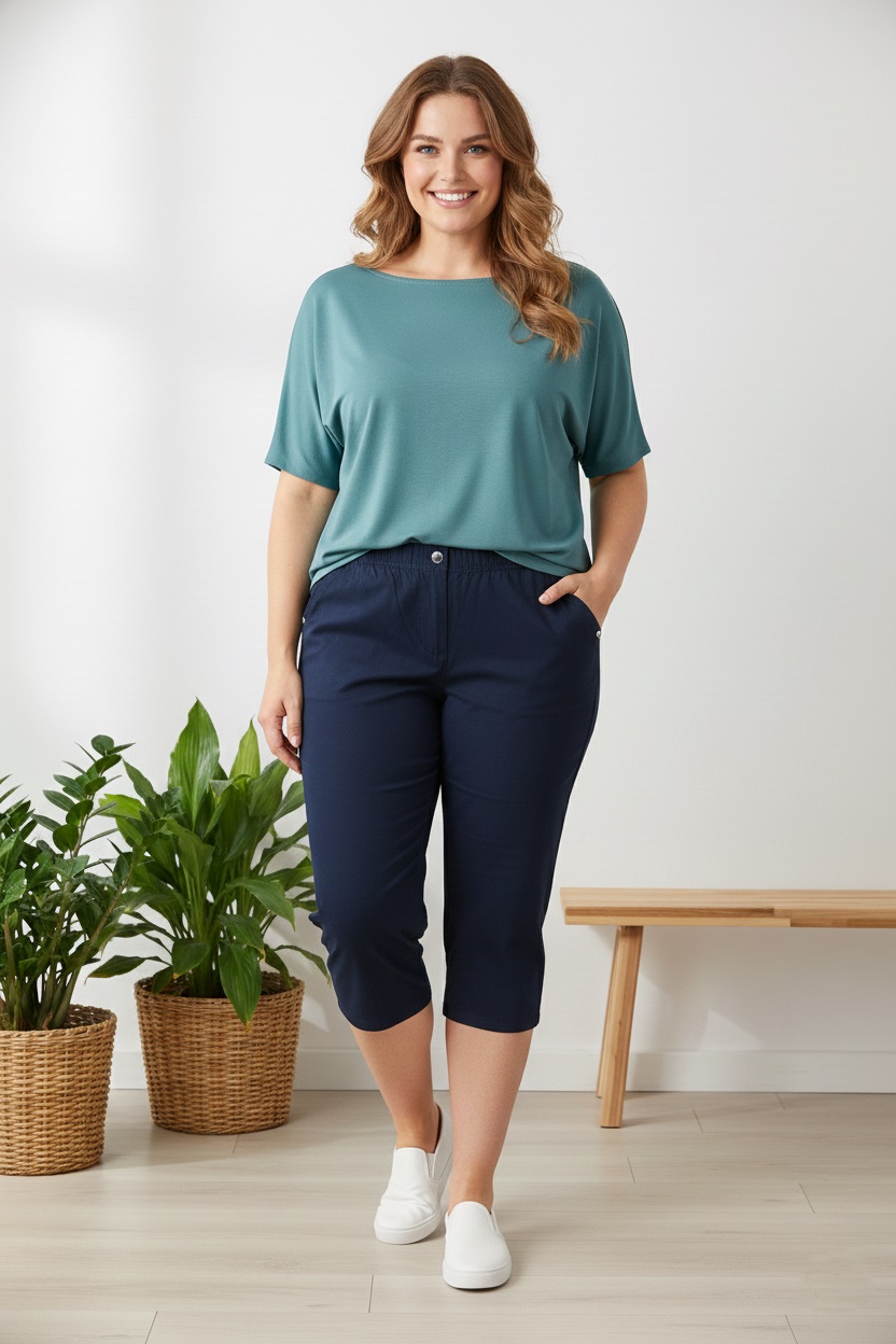 De ultieme zomer en vakantie broek  is van Zhenzi. De broek is gemaakt in een stretch bengaline stof met veel rek. In de taille zit elastiek en er is een gulp. Aan de onderkant zit een klein splitje in de zijnaad. Het Zhenzi model draagt hierbij de blouse 2103246.