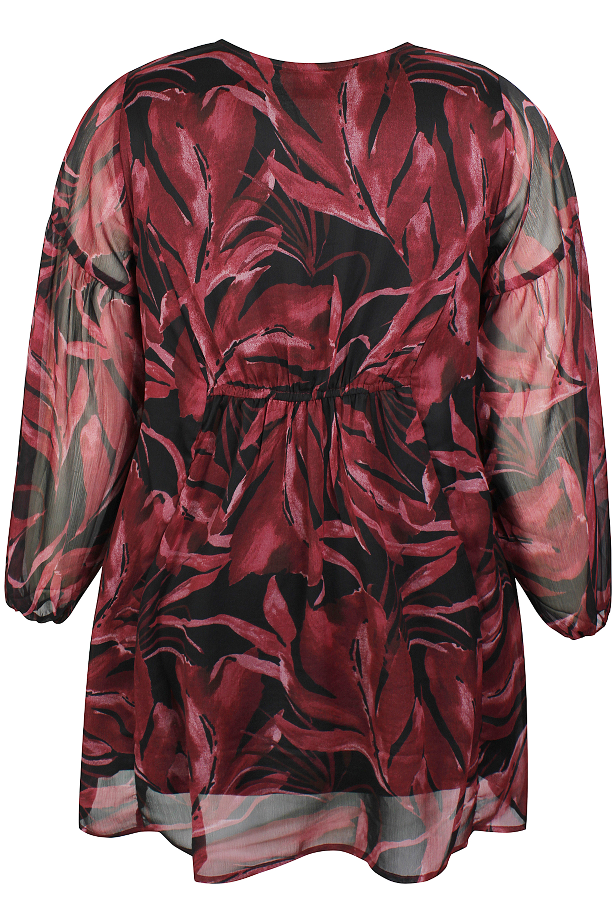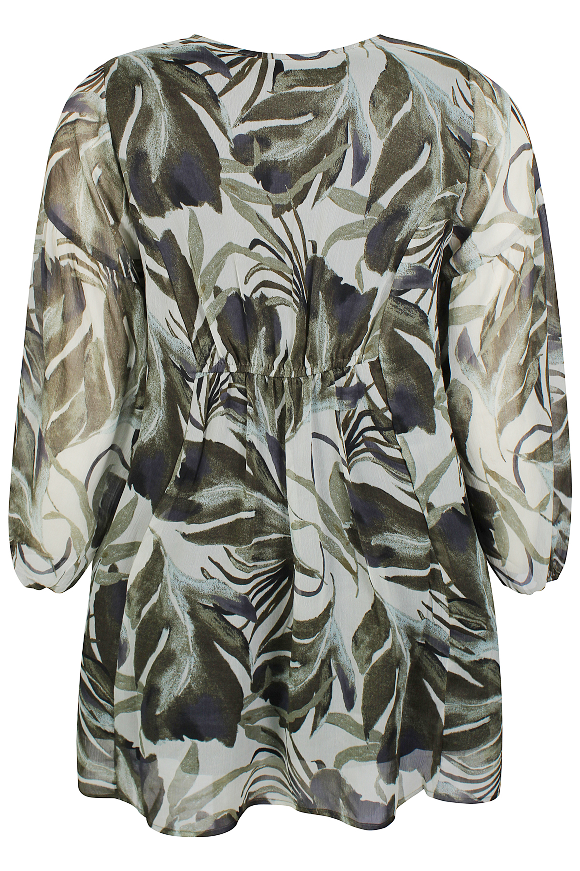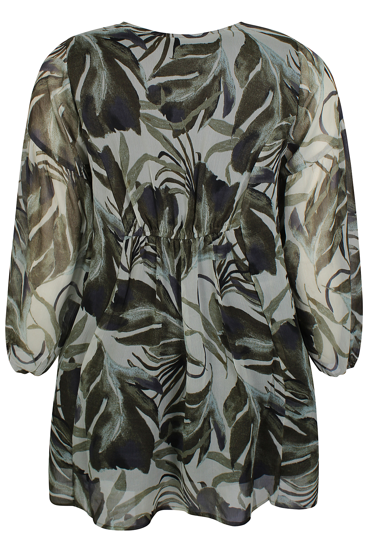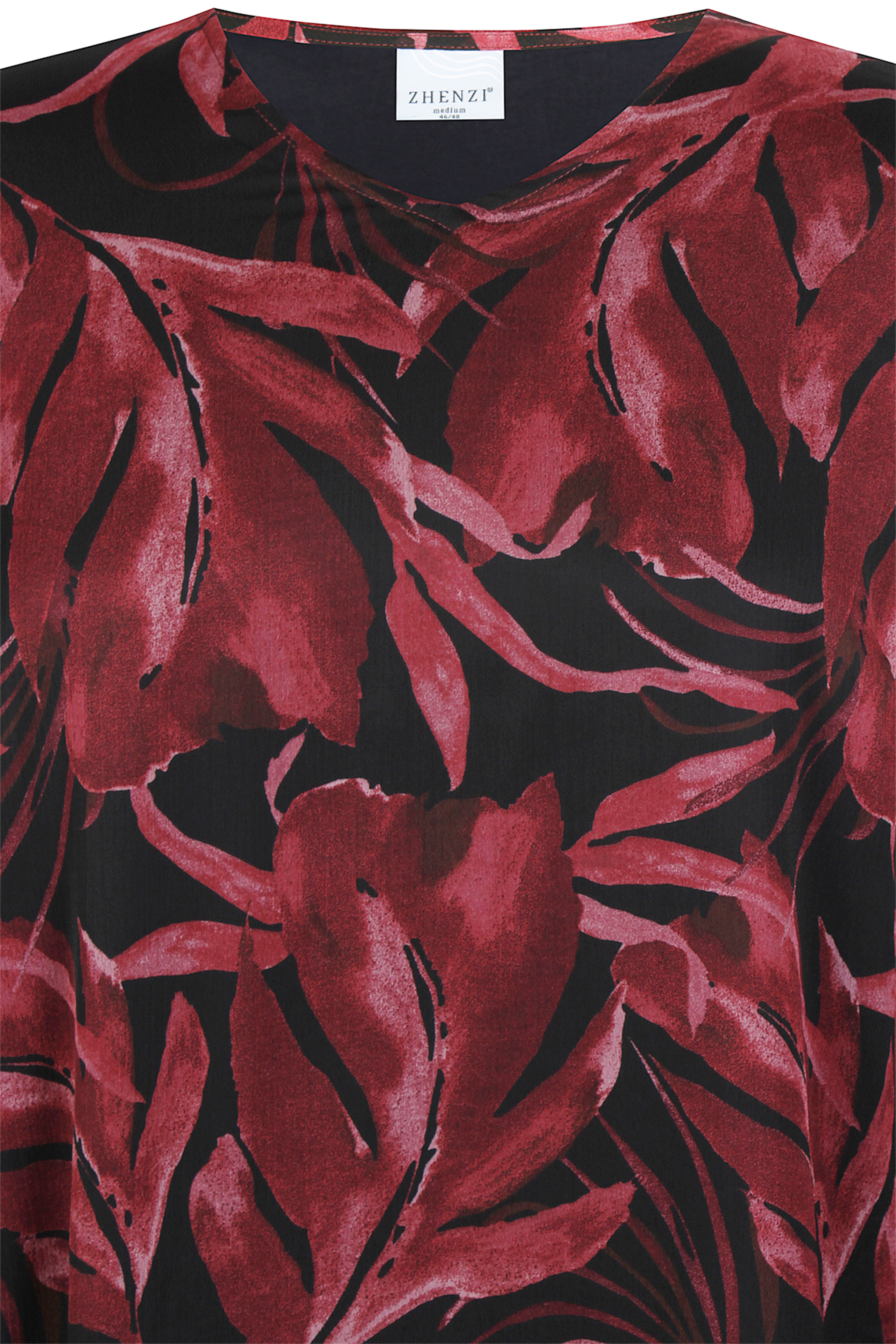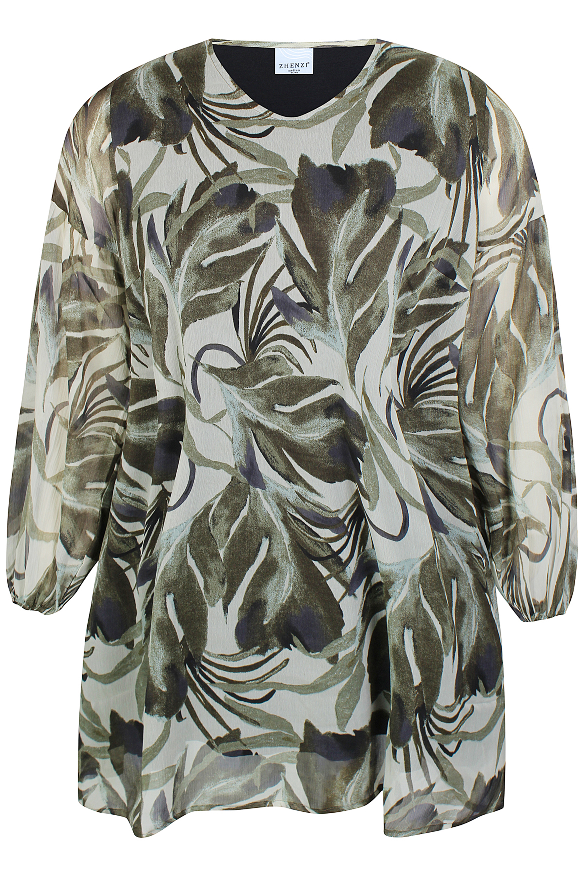 ZHENZI a-lijn tuniek heeft een groot bladprint, verkrijgbaar in 3 kleurstellingen. De tuniek is gemaakt in een voile stof, de panden zijn gevoerd en de lange pofmouwen schijnen door. In het achterpand zit in een deel van de taille een elastiek, zo sluit het model mooi aan in je rug. In het voorpand zit een deelnaad onder de buste. Het model combineert hier een basis legging.