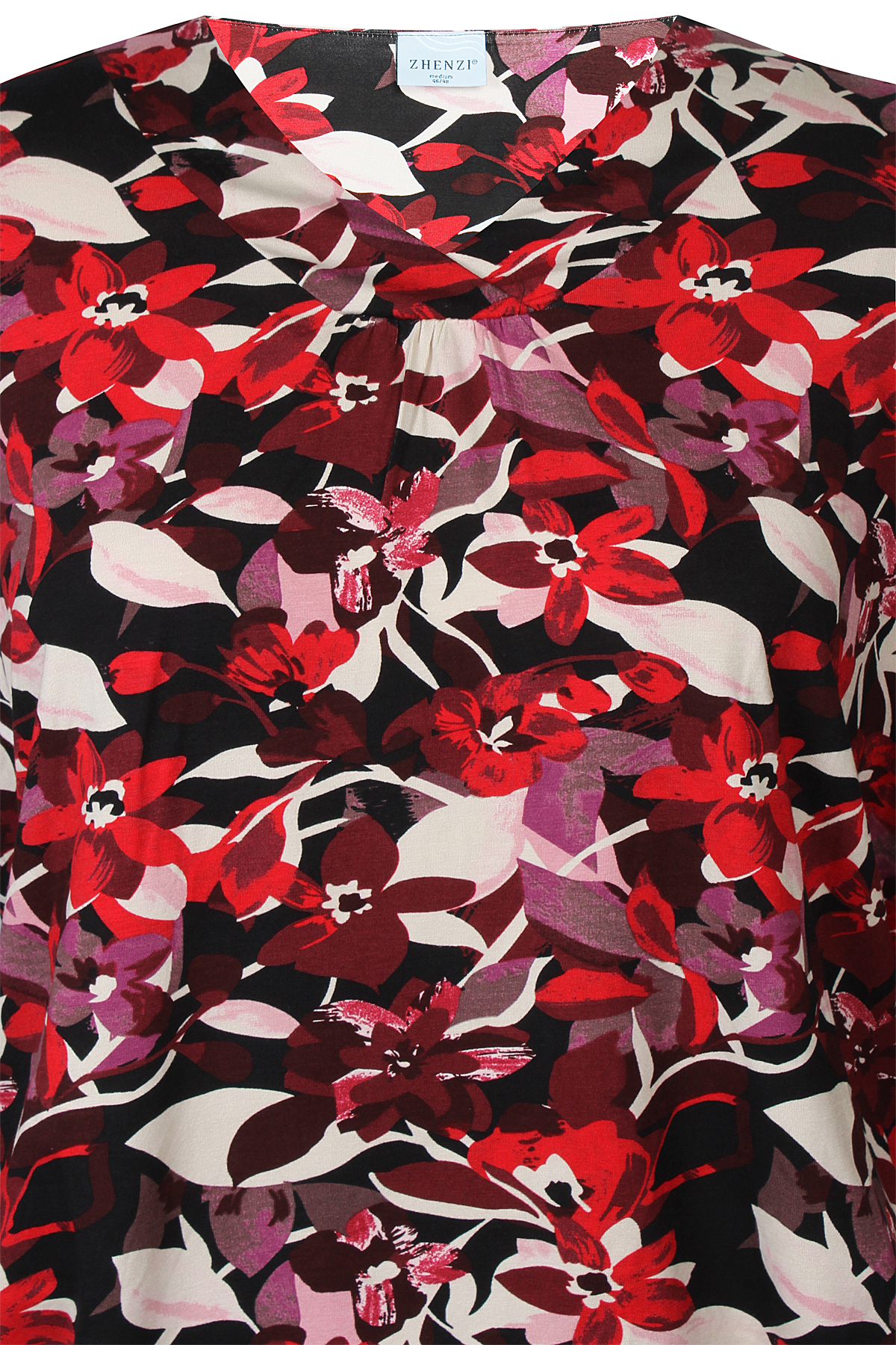 De print bestaat uit grote bloemen in twee kleuren - stone green/maroon op een zwarte ondergrond. Door het opvallende patroon is deze blouse geschikt voor wie een uitgesproken bovenstuk zoekt dat zonder verdere details gedragen kan worden. De blouse heeft geen sluiting en wordt over het hoofd aangetrokken. De lengte valt tot op de heup en is geschikt om los te dragen of deels in de broek te steken.