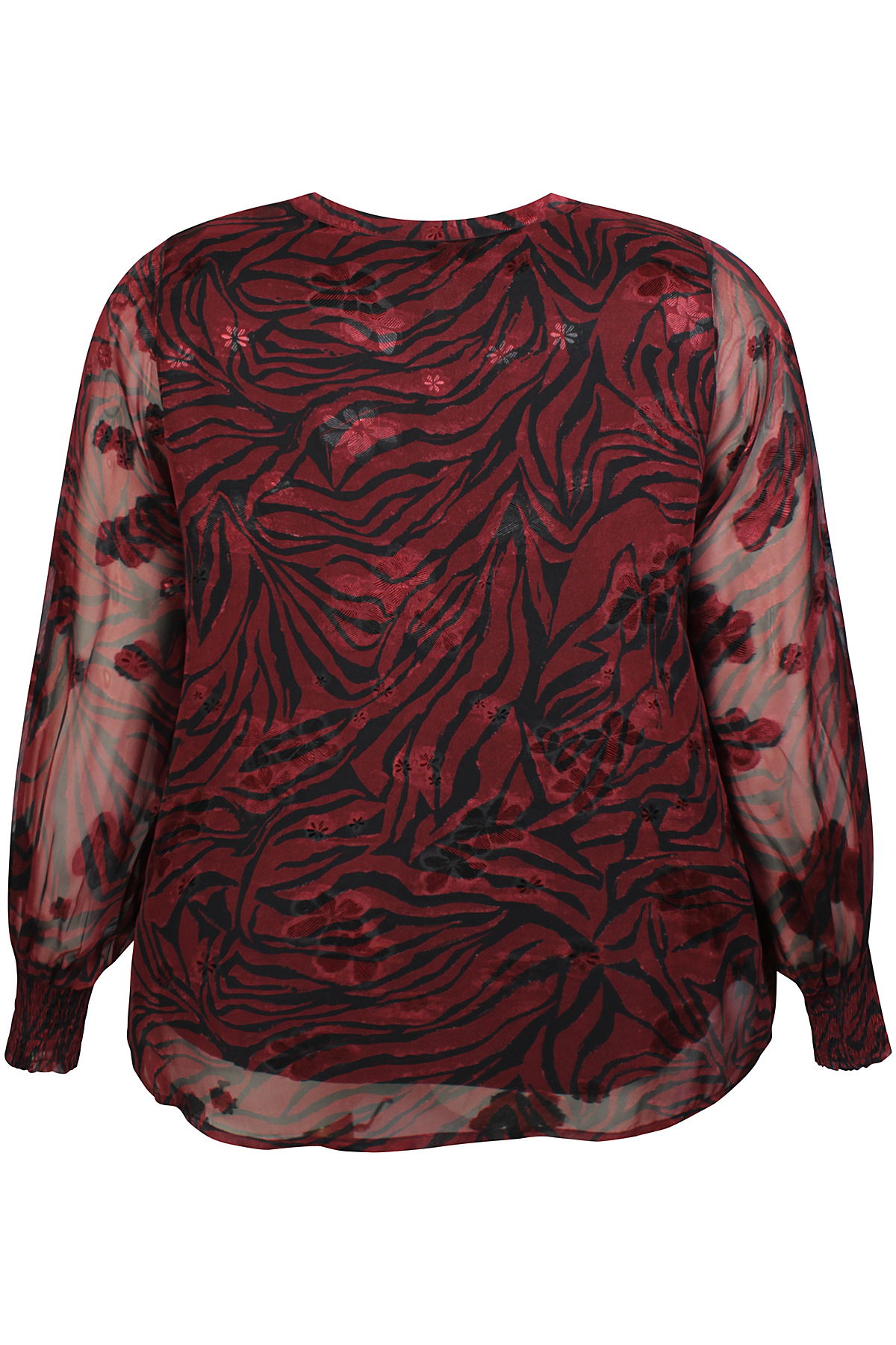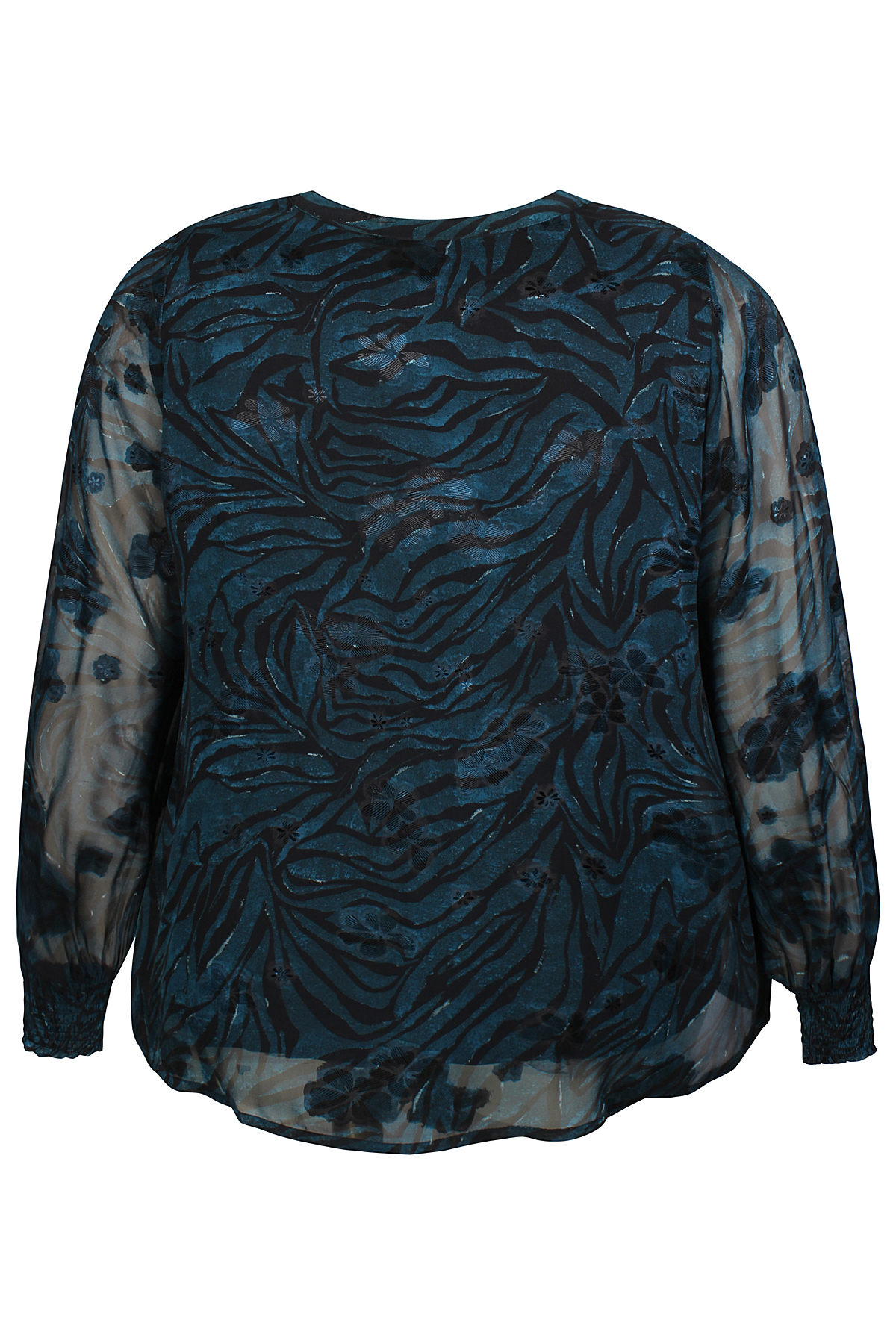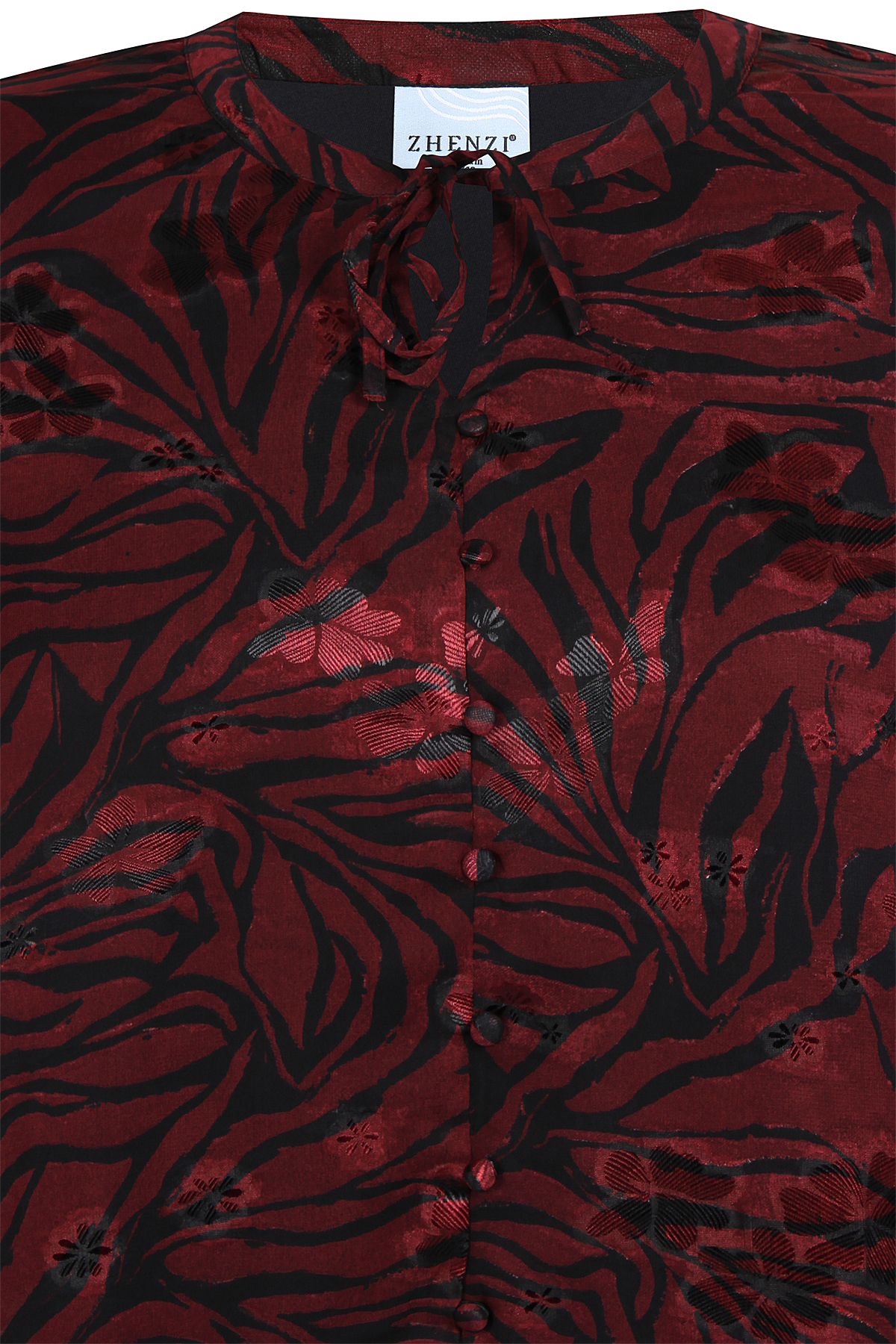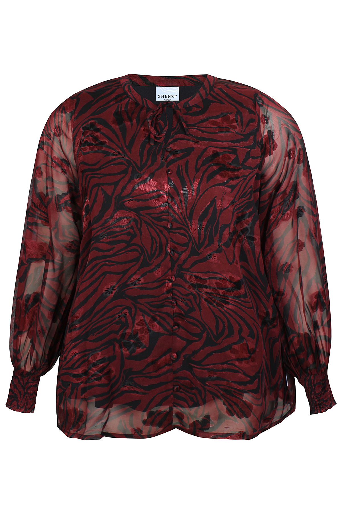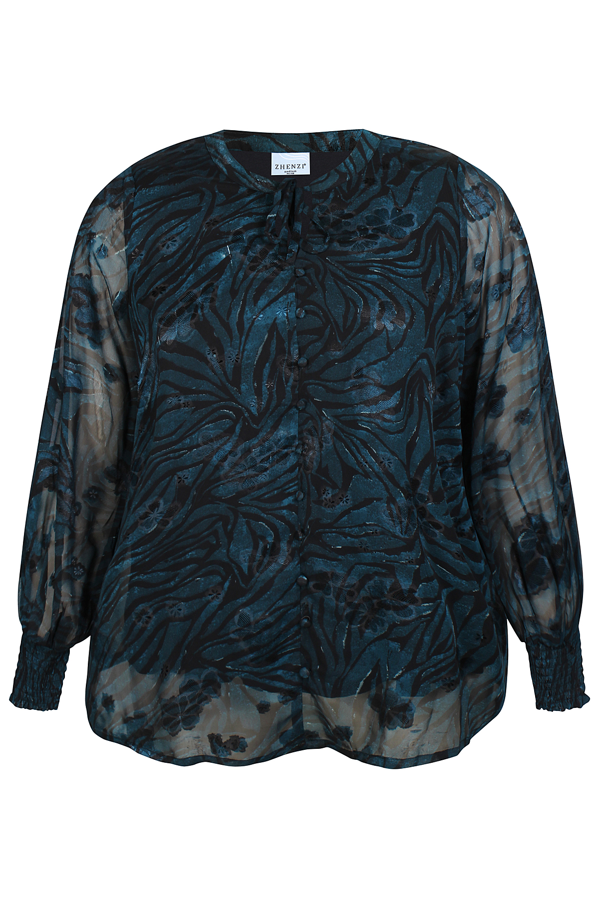 ZHENZI blouse Tula is gemaakt in een doorschijnende stof met een zebra motief en erop een glans bloem. Hij heeft een singlet voering, dus de mouwen schijnen door. De lange mouwen hebben een lange smock elastiek manchet. Hij heeft een smal boordje bij de hals met strikkoord. Middenvoor zitten stofknoopjes, deze kunnen niet open. De blouse heeft een normale lengte en pasvorm. Kortom een mooie blouse voor een feest of gewoon op een jeans combineren.