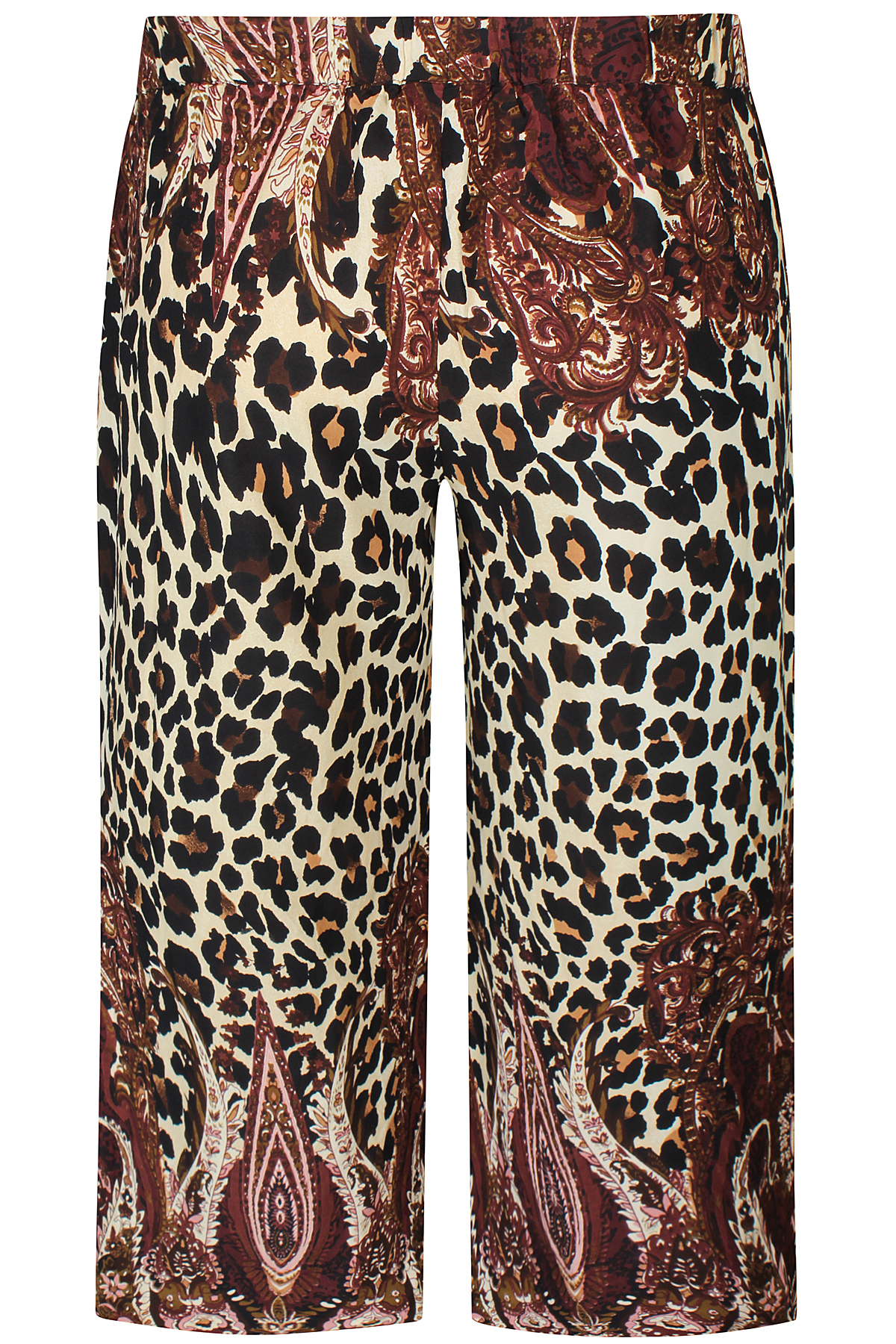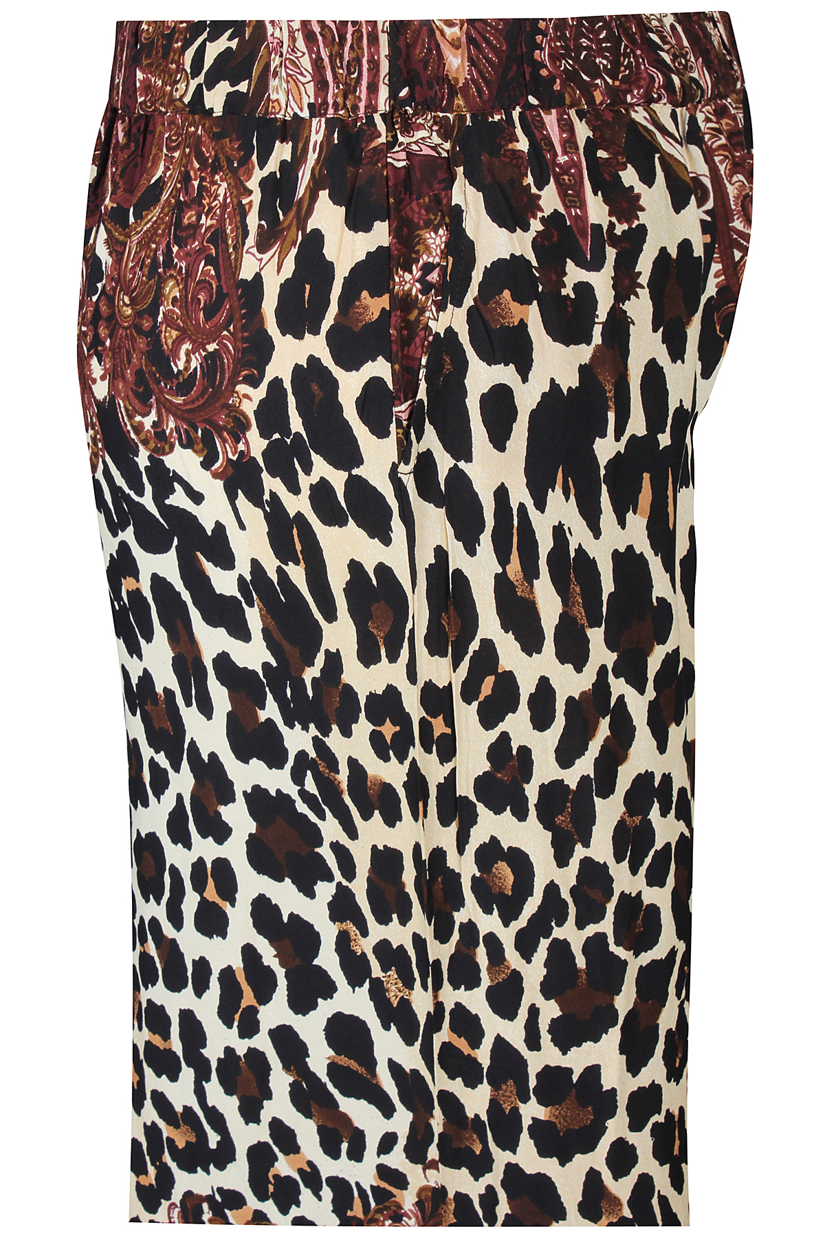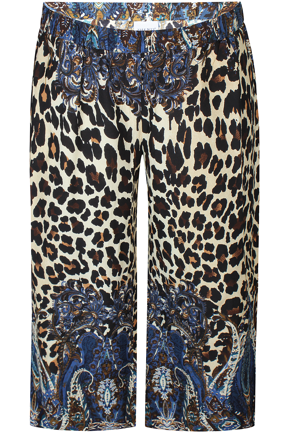 De print bestaat uit een combinatie van luipaardmotief op een beige ondergrond, in combinatie met een paisleyprint in blauwtinten langs de onderzijde van de pijpen. De print is volledig rondom geplaatst en loopt door op beide broekspijpen.