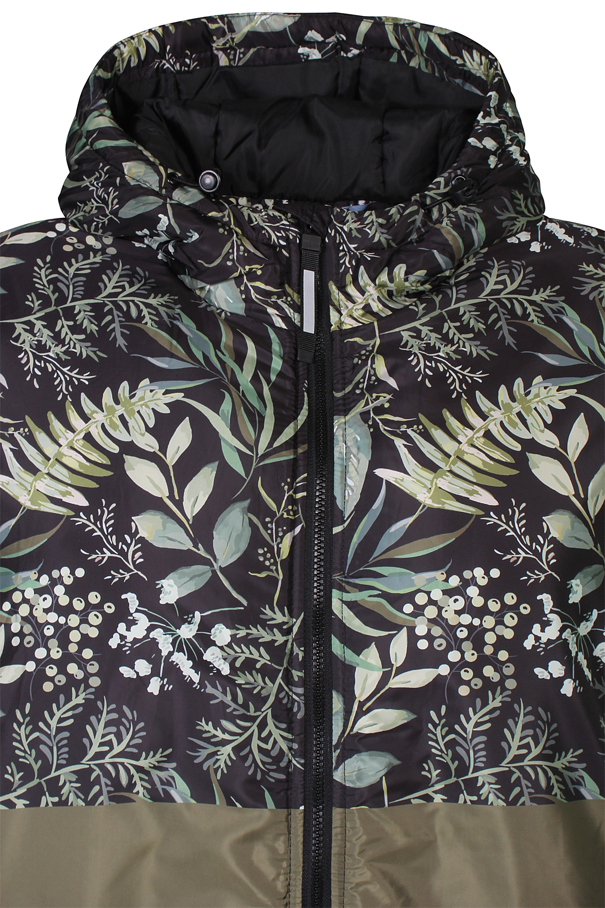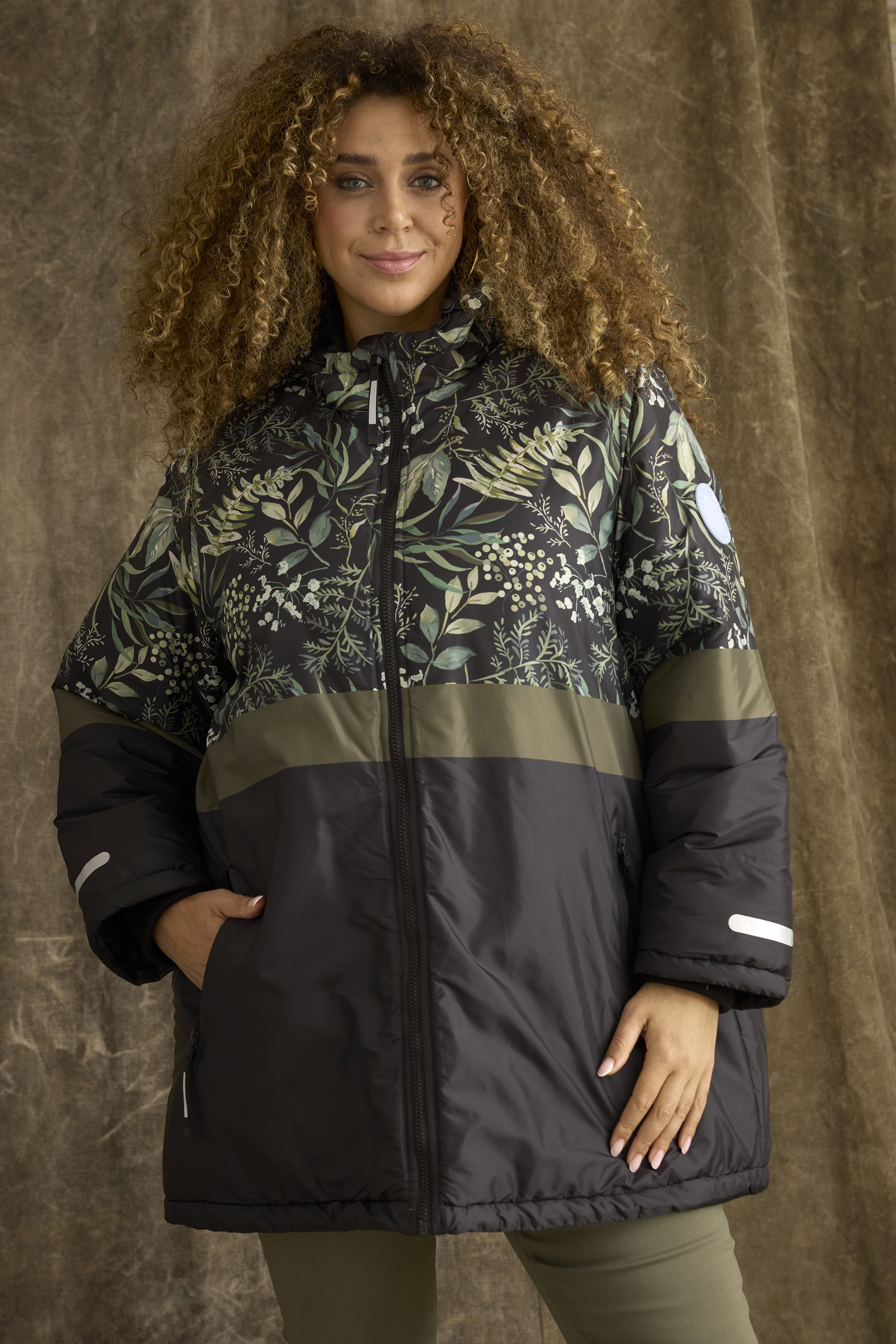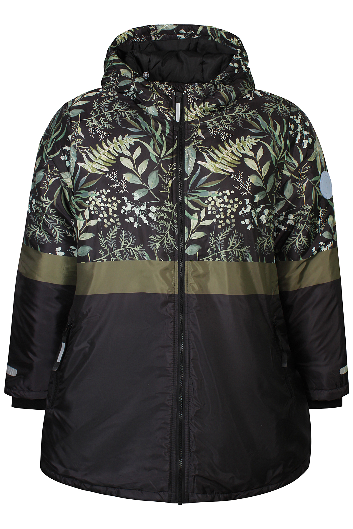 Deze jas Nana van Zhenzi combineert functionaliteit met stijl en biedt bescherming tegen kou en regen. Het bovenste gedeelte heeft een floraal patroon op een donkere stof, terwijl het onderste deel zwart is met een  horizontale strook. De jas is voorzien van een verstelbare capuchon. De mouwen zijn elastisch afgewerkt voor betere isolatie, en de jas heeft een ritssluiting met een windvanger. De mouwen zijn bovendien voorzien van ingevoerde manchetten, die extra warmte bieden door het afsluiten van de mouwopening. Reflecterende details zorgen voor zichtbaarheid in het donker en praktische zijzakken met ritssluiting. Met een licht oversized pasvorm is deze jas perfect voor zowel actieve als casual buitenactiviteiten.