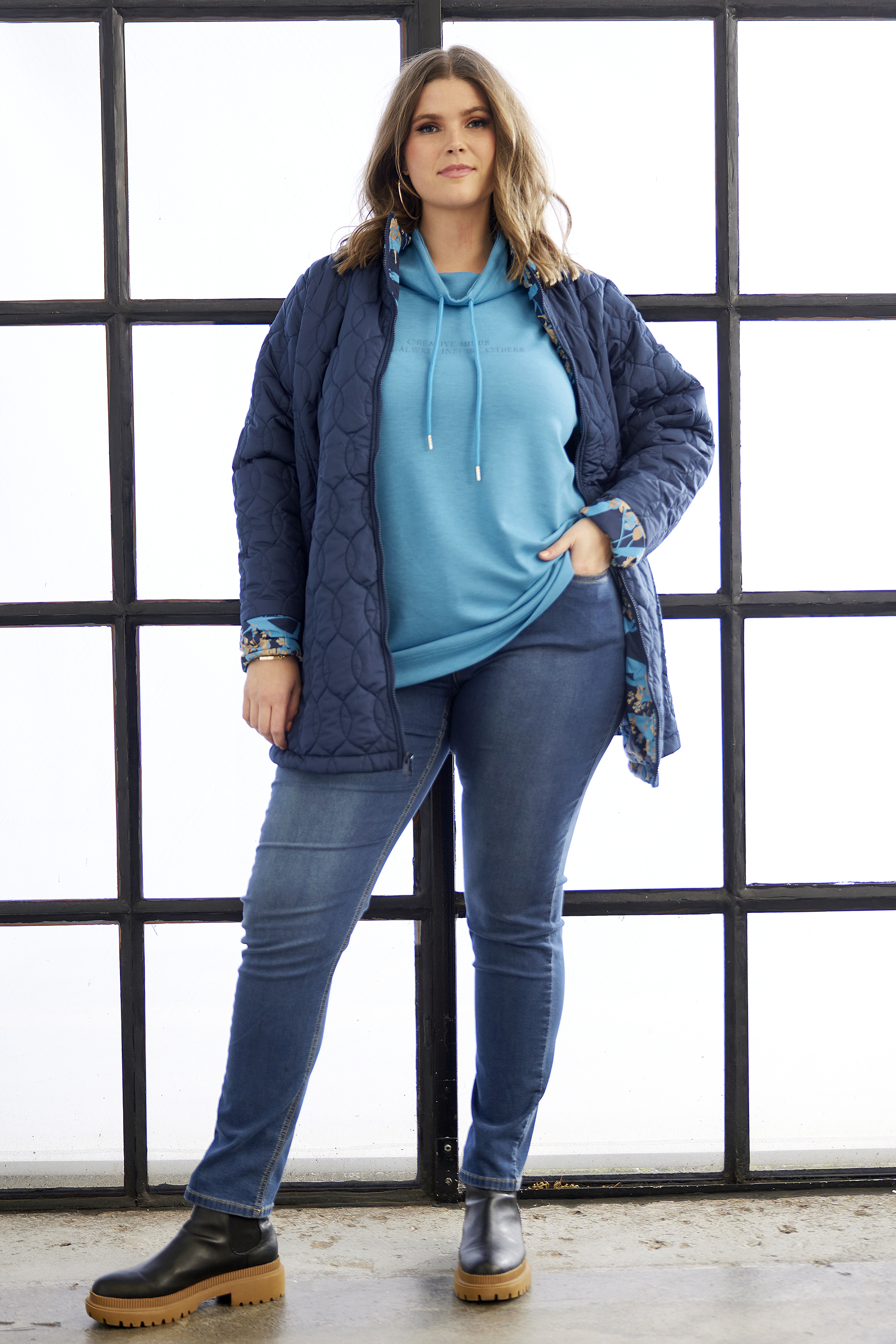 Is dit geen super leuke jas van ZHENZI model Samira? Hij kan tweezijdig gedragen worden. Of je draagt de print kant of de uni kant. Bij de print kant zitten opgestikte zakken en bij de uni kant zitten paspel zakken die zijn afgewerkt met een randje van de print stof. De jas sluit met een rits en heeft lange mouwen met een smalle boord, bij maat M is deze 28 cm rondom. De print stof zit los van de binnenvoering en bij de uni stof is deze doorgestikt. De jas heeft een smal opstaand boordje. Meer jassen vindt je in de link.