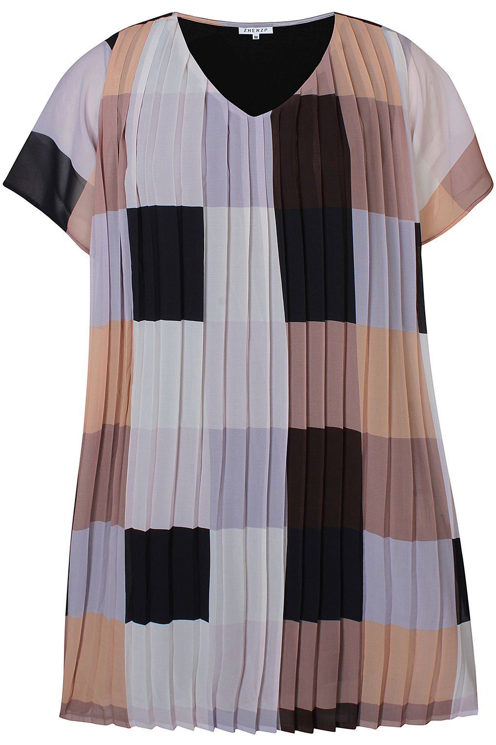 ZHENZI jurk ELLISON is gemaakt in een voile plissee stof met een patchwork look. Hij heeft een singlet voering jurkje. Het is een Alijn model met een V hals en kort licht uitlopende mouwen.