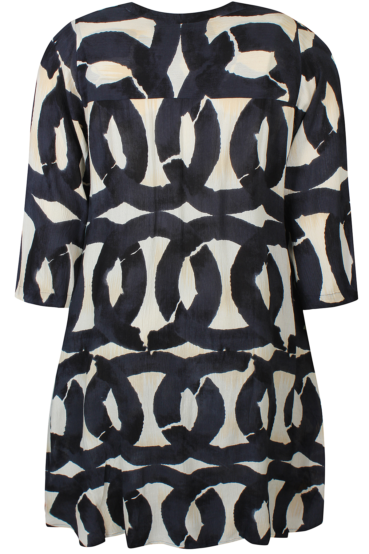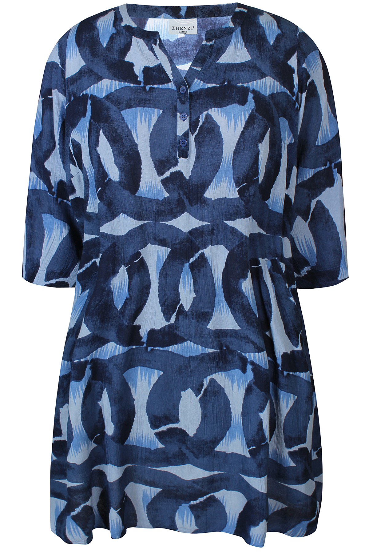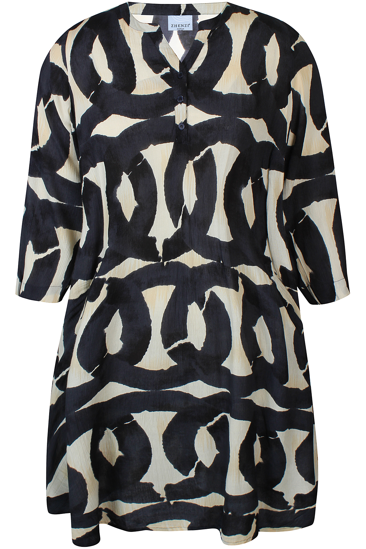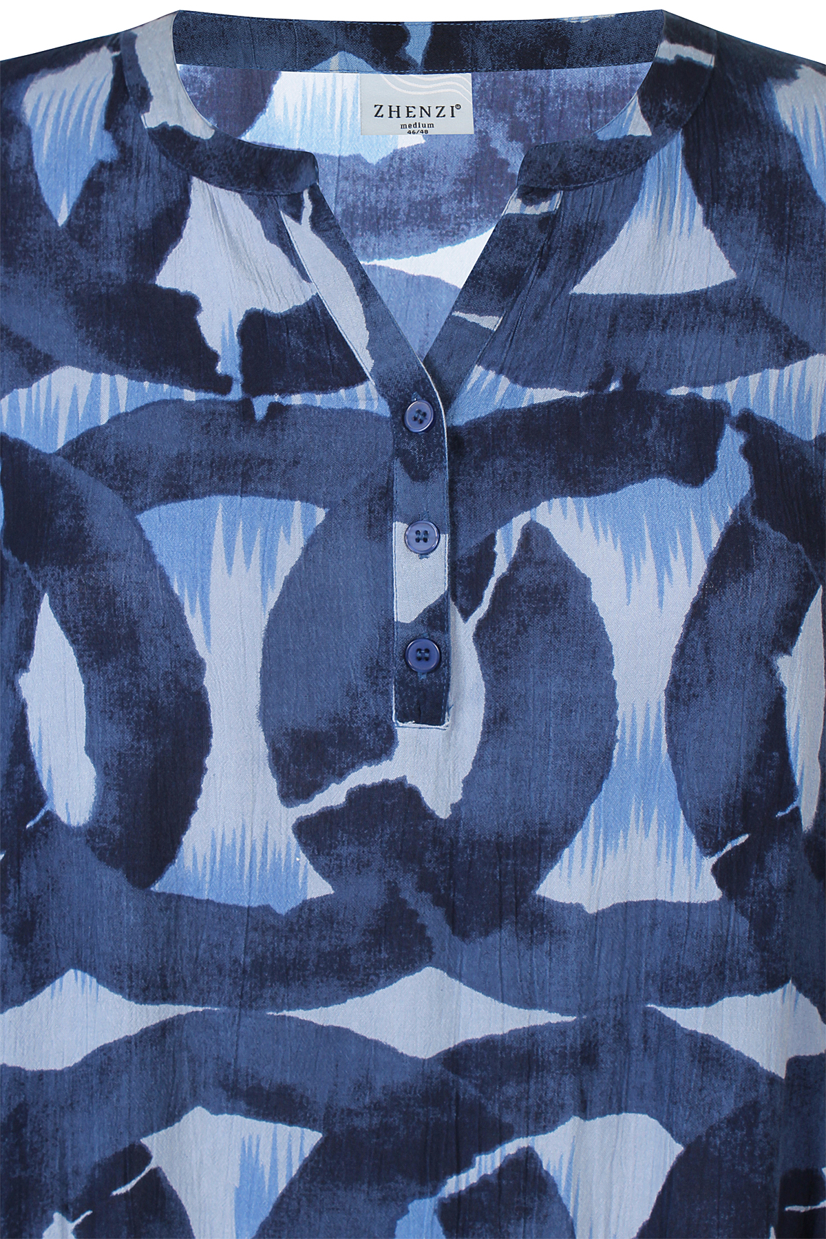 De ZHENZI jurk Sini is een rechtvallende tuniekjurk met een los model en doorknoopsluiting tot halverwege de borst. De jurk is gemaakt van een soepele, niet-elastische stof en heeft een opvallende abstracte print. Het ontwerp heeft een ronde zoom en valt ruim over de knie, afhankelijk van de lichaamslengte.