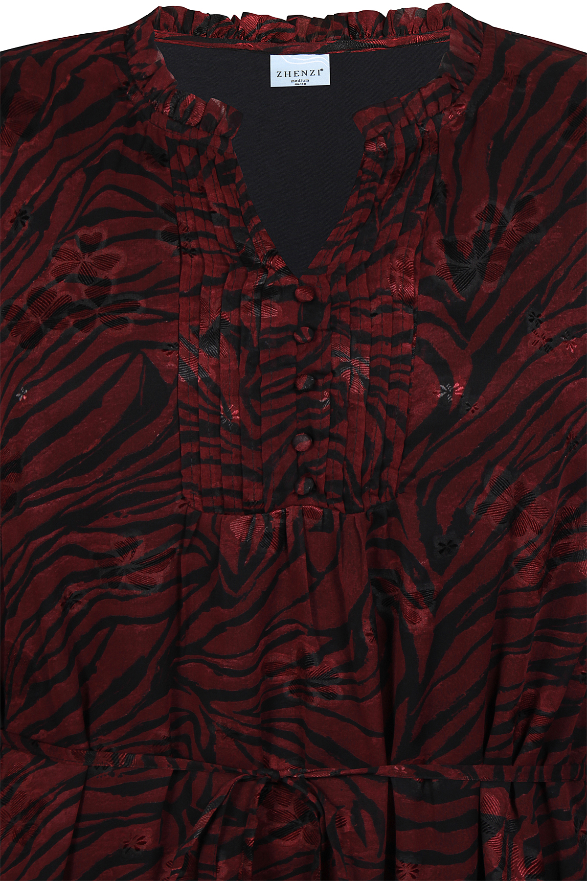 Maak indruk met de ZHENZI jurk Tula, in een rijke burgundy red kleur. De jurk heeft een vaste onderjurk en deels voile mouwenDit model straalt elegantie uit en combineert perfect met de trends voor herfst/winter. De jurk is gemaakt van comfortabele, gladde stof die niet stretch bevat, waardoor hij mooi valt en een verfijnd silhouet creëert.