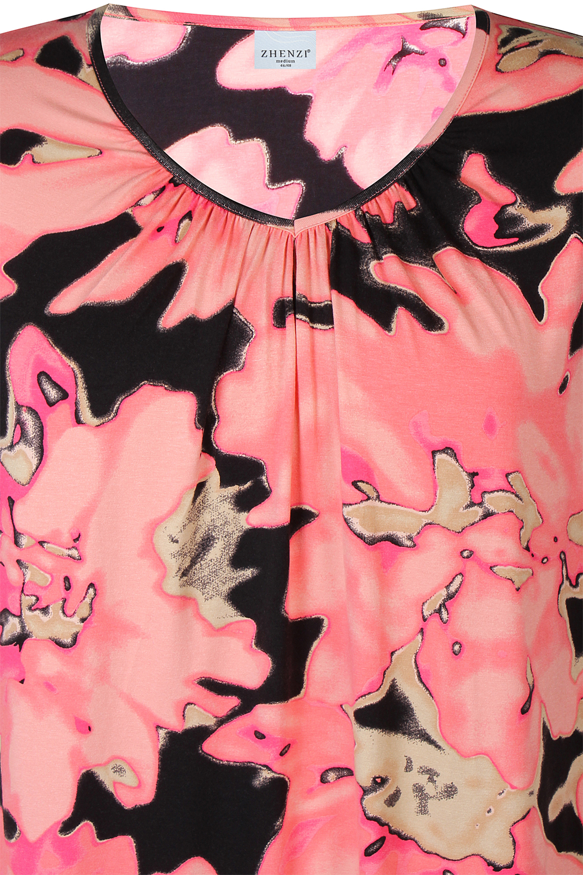 ZHENZI shirt Fipa is een model met een diepere hals die een beetje in een V valt. Onder de hals is hij gerimpeld, voor meer buste ruimte. Hij heeft een licht A lijn pasvorm en korte mouwen. Draag hem bij de bermuda van ONLY model 15293187.