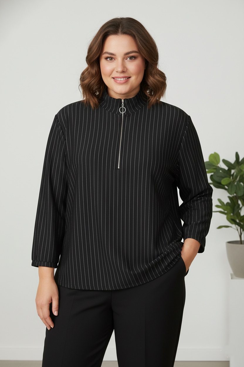 De ZHENZI Trui Sama is een hoogwaardige, sportief-geïnspireerde top, ontworpen met oog voor detail en functionaliteit. Het model is vervaardigd uit een duurzame stof met een subtiele streepstructuur, wat zorgt voor een verfijnde, moderne uitstraling. De trui is voorzien van een praktische rits aan de voorkant, die de mogelijkheid biedt om de halslijn naar wens aan te passen voor extra comfort en veelzijdigheid.