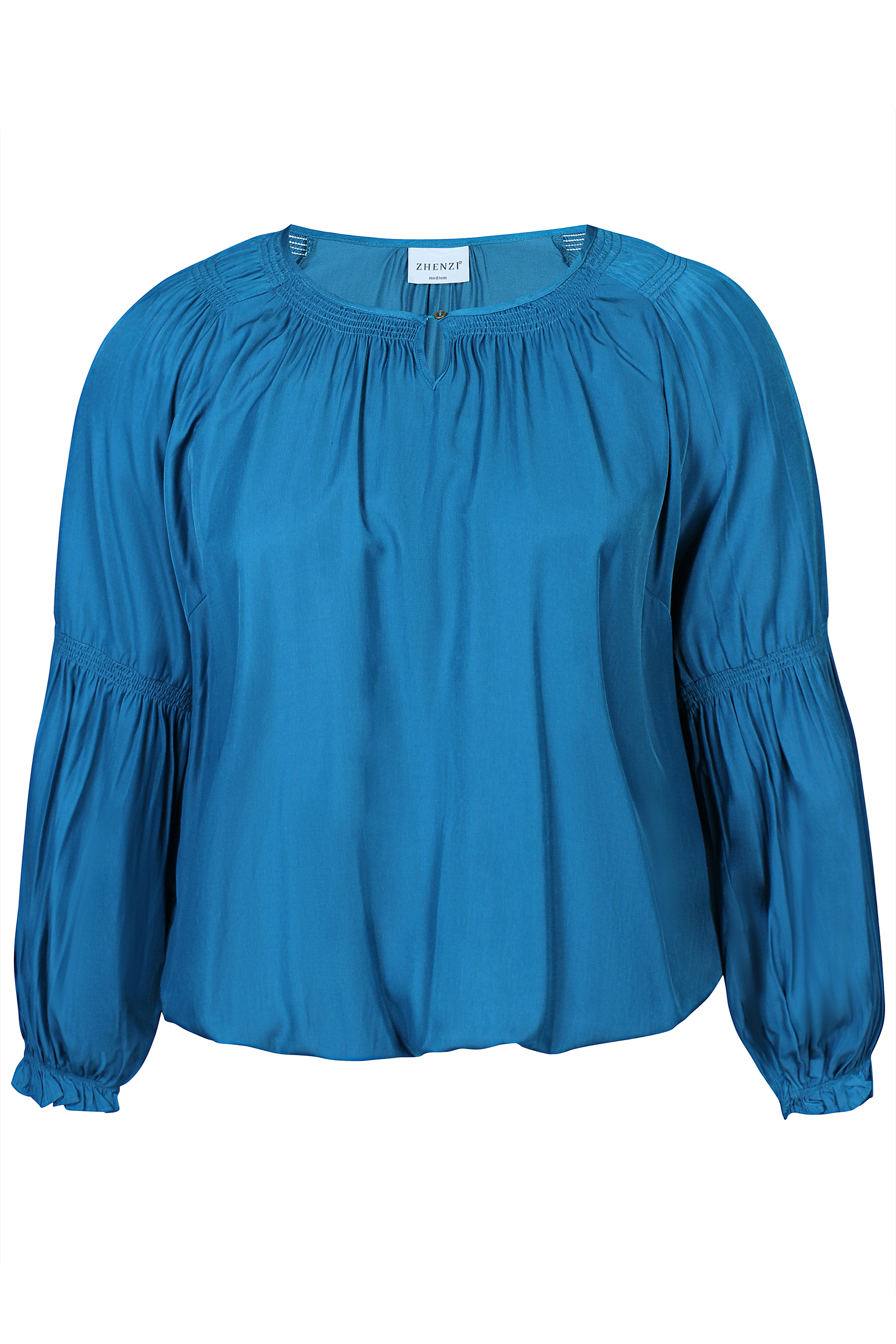ZHENZI tuniek blouse is gemaakt in een mooie satijn stof. Hij heeft een ronde hals met elastiek detail en ie hieronder gerimpeld. De lange mouwen hebben halverwege een elastiek detail en onderaan bij de mouwopening. In de zoom zit ook elastiek. Met een mooie zwarte broek maak je er een feestelijke set van.