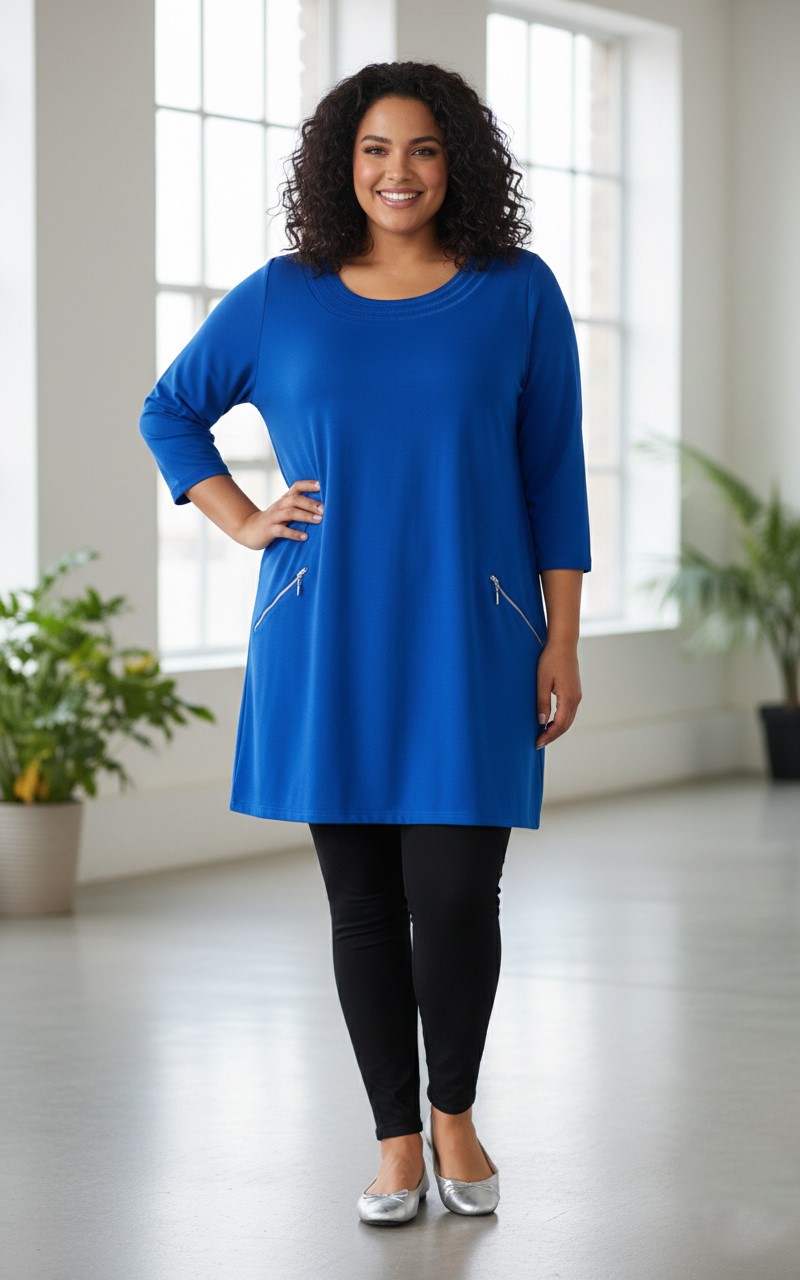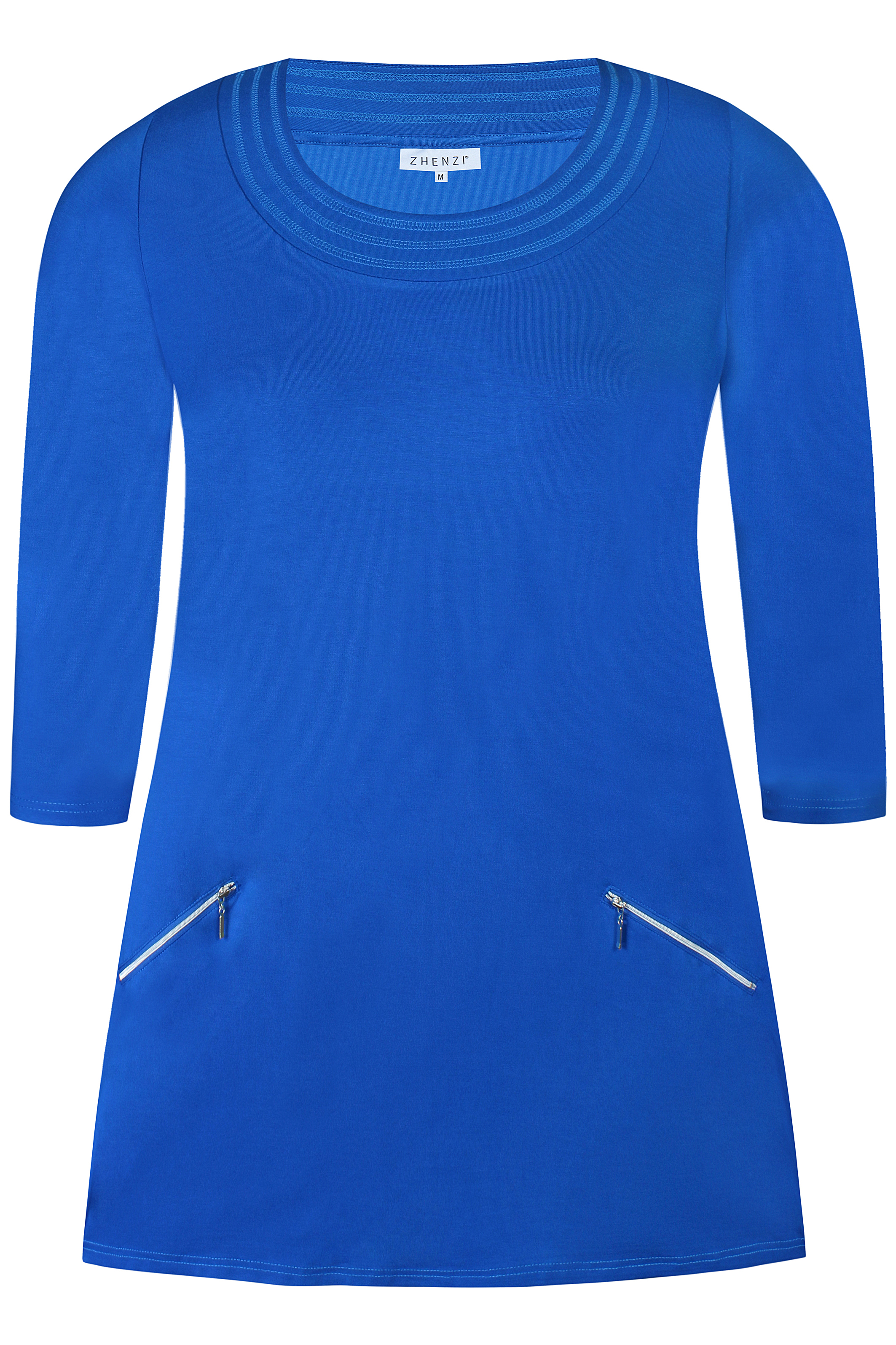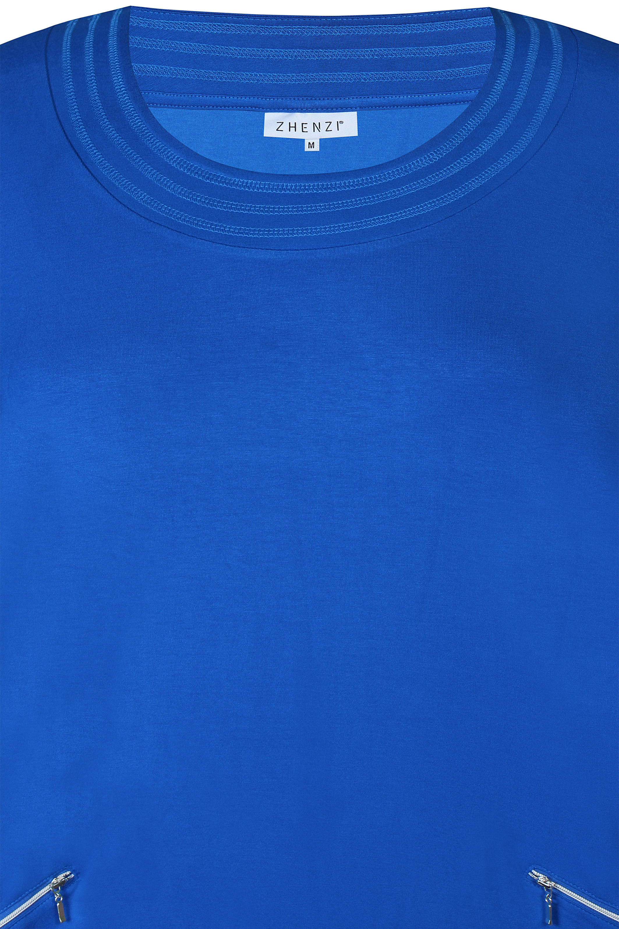 ZHENZI tuniek Jolie is gemaakt in een mooie uni  tricot. Hij heeft een doorgestikte ronde hals en driekwart mouwen. In het voorpand zitten ritszakken verwerkt. Hij heeft een Alijn pasvorm.