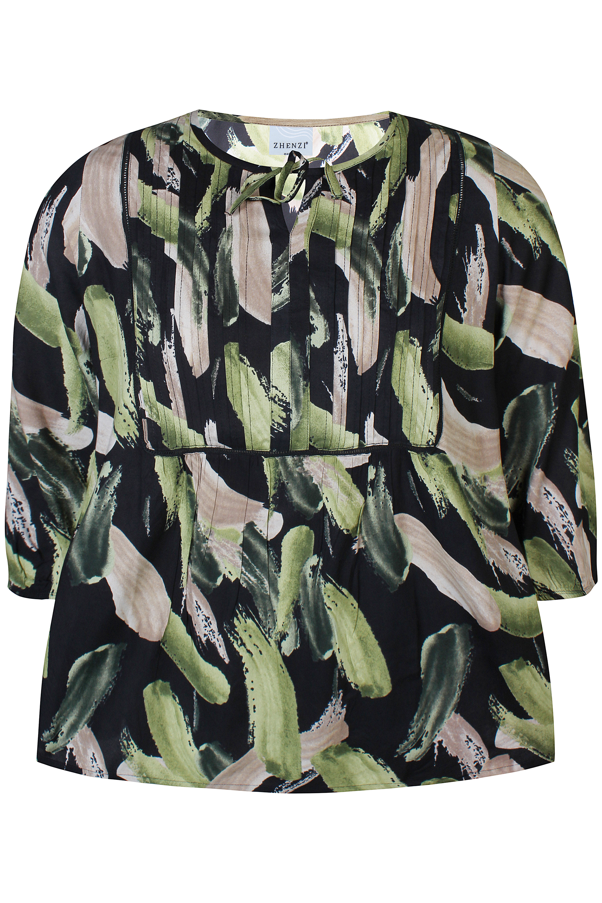 ZHENZI tuniek Lillie is een super leuk model met een Alijn pasvorm. De ronde hals heeft een V split en strikkoord. De pas onder de hals heeft doorgestikte platte plooien en rondom een opengewerkte rand. Deze rand zit ook bij de rugpas. De mouwen vallen driekwart en hebben een elastiekje in de zoom. Leuk om te combineren met een jeans, maar ook met de halfwijde broek uit de Zhenzi collectie 200379. Voor andere leuke tunieken kunt u kijken in de categorie grote maten tunieken.