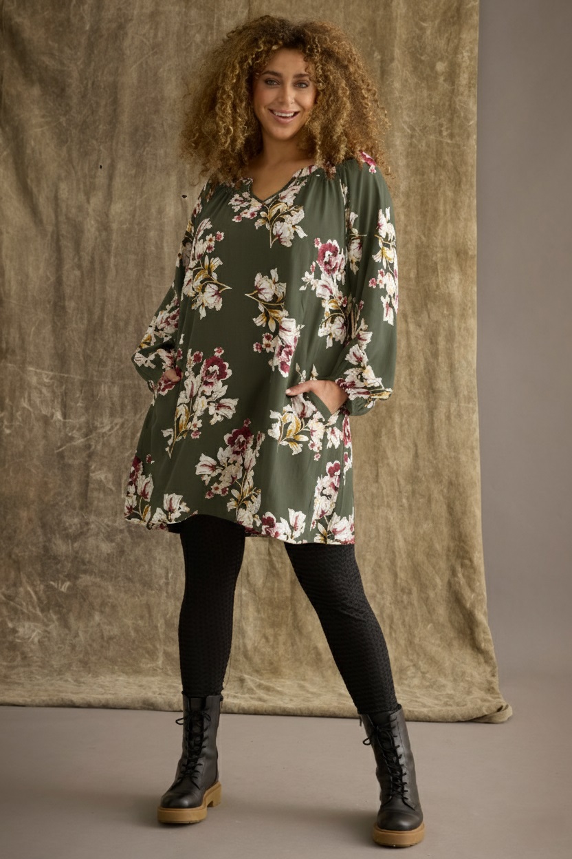 De tuniek heeft een losvallende pasvorm die soepel langs het lichaam valt, met een V-hals en lange, licht poffende mouwen die eindigen in elastische manchetten. Praktisch detail - de Ozie tuniek is voorzien van steekzakken aan de zijkanten, zodat je altijd een plek hebt voor kleine essentials.