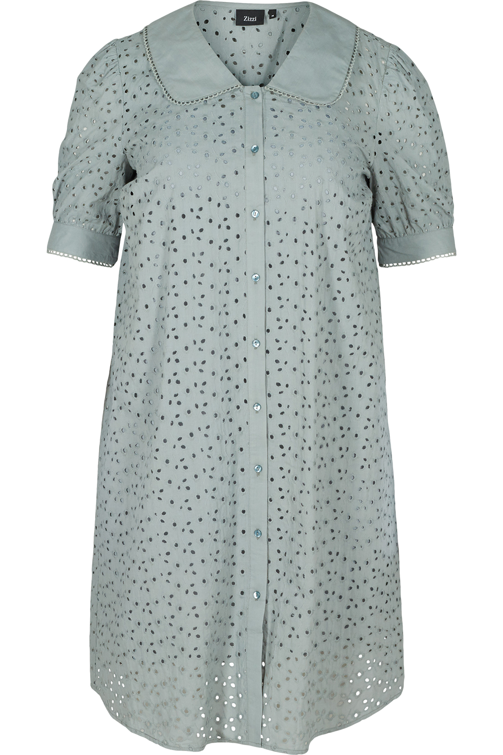 Is het niet geen schatje dit jurkje van Zizzi. Hij is gemaakt in een ajour stof, dus opengewerkt en doorschijnend. Gelukkig zit er een onderjurkje bij. De jurk heeft een grotere kraag die afgewerkt is met een smal opengwerkt randje. Ook de korte pofmouwen hebben dit effect aan de mouwopening. De jurk heeft een lichte A-lijn pasvorm en sluit met glans knoopjes. Bij maat S valt hij 94 cm lang.. De voering van de jurk is gemaakt in een 100% viscose tricot. Je vindt al onze jurken in de categorie grote maten jurken.