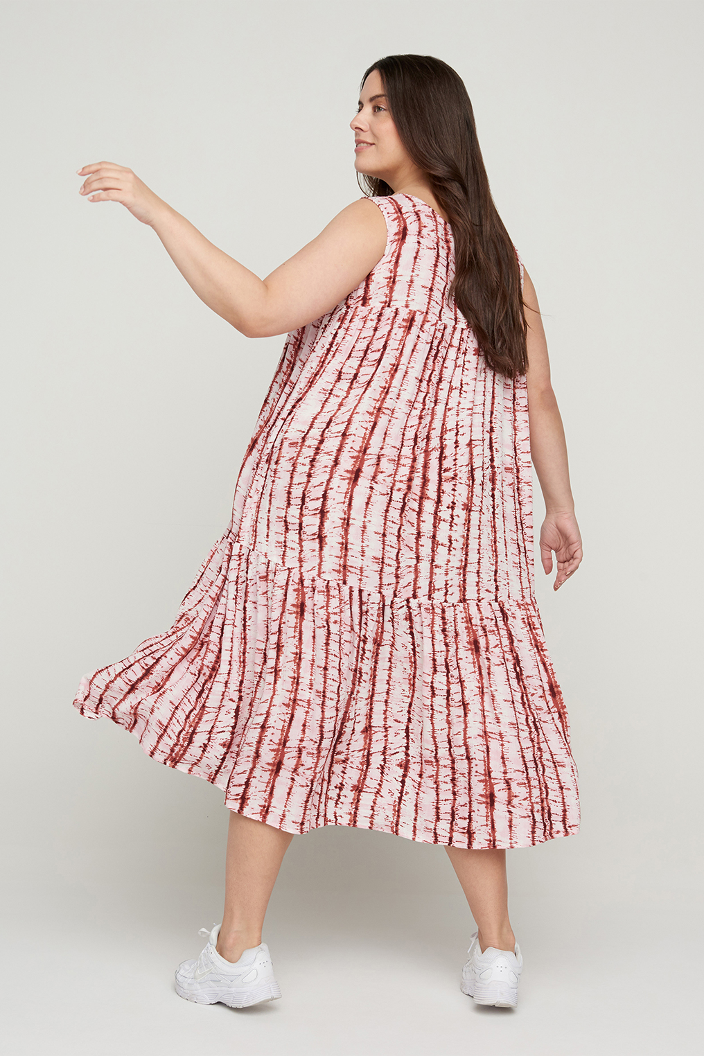 Wat een ontzettende leuke jurk van Zizzi! De jurk heeft een tie dye print en een losse Alijn pasvorm. Hij heeft een hoge pas bij de ronde hals en aan de onderkant een brede ruche strook. De stof heeft een licht crincle effect, heerlijk materiaal voor de warme dagen. De lengte valt halverwege de kuiten.